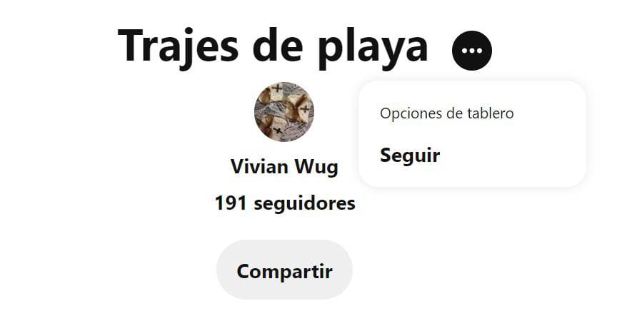 Una vez que haces clic en un tablero, podrás ver la cantidad de seguidores. Si deseas seguir el tablero, haz clic en los tres puntos junto al nombre y selecciona Seguir.