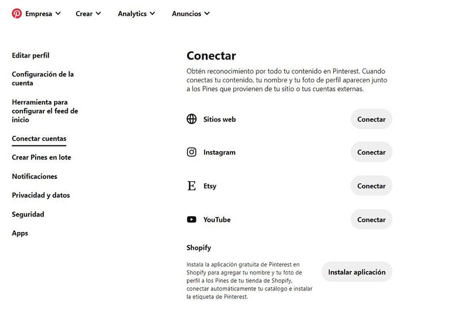 Desde las configuraciones de cuenta de tu Pinterest, haz clic en Conectar Cuentas en el menú en la parte izquierda de la pantalla. Tendrás la oportunidad de conectar tu sitio web, Instagram, YouTube y las tiendas de Shopify y Etsy. Simplemente haz clic en el botón Conectar, inicia sesión en tu cuenta y concédele el acceso requerido a Pinterest.
