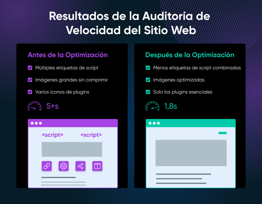 Incluso las mejores optimizaciones del servidor no pueden solucionar temas mal codificados o 100 imágenes sin comprimir. Una auditoría exhaustiva de tu sitio te ayudará a abordar problemas de la parte frontal o a nivel de aplicación.
