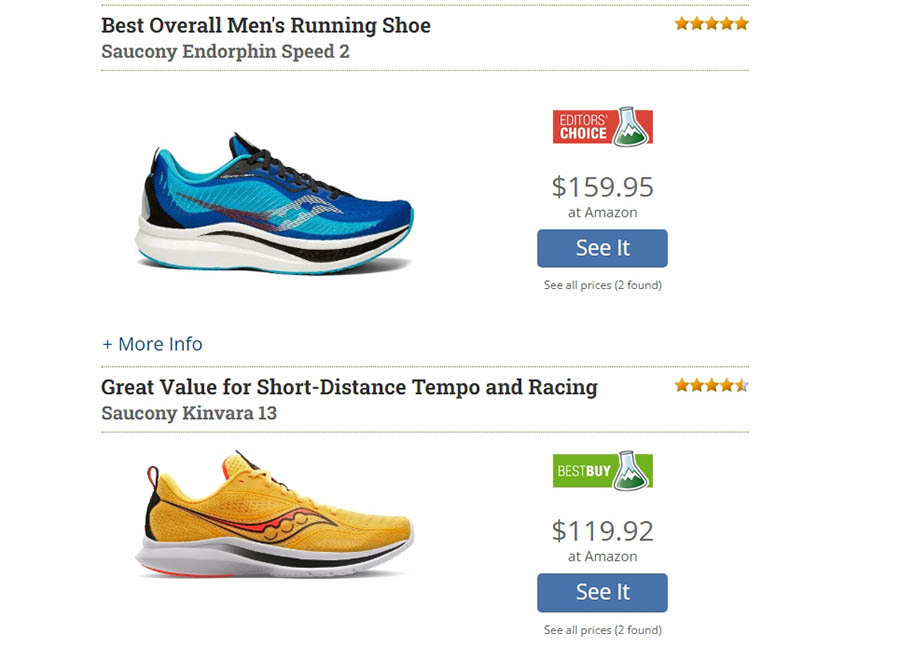 El enfoque de GearLab es similar. En sus reseñas sobre artículos para actividades al aire libre, verás secciones de productos (donde cada lector puede comprar), separadas del contenido.