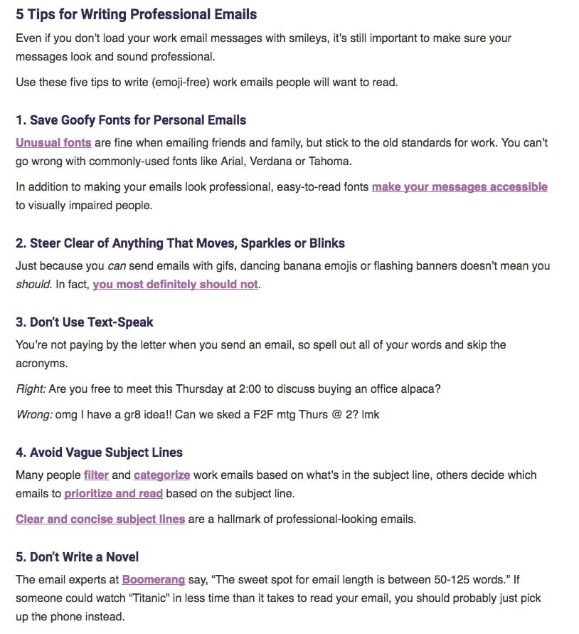 Y hablando de profesional, tomate con calma el uso de las mayúsculas, puntuación, la letra cursiva, incluso la jerga demasiado técnica de tu nicho. Construye tu copia como si estuvieras escribiendo una hoja de vida, en vez de que se parezca a un mensaje de texto.