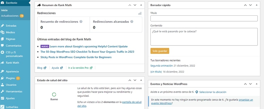 Una vez instalado WordPress, inicia sesión en “tudominio.com/wp-login.php”. Desde allí, verás un panel de control fácil de usar en el que podrás gestionar todo, desde las entradas hasta los plugins.