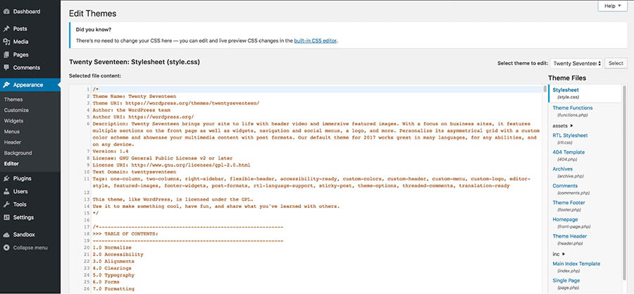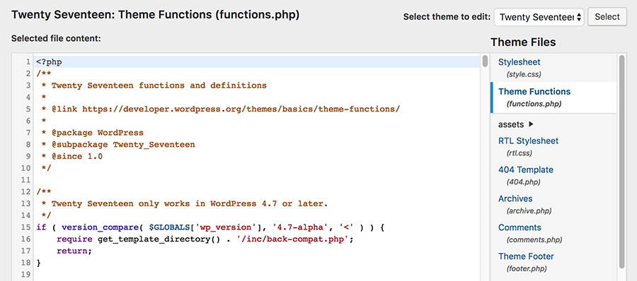 Dependiendo de tu tema WordPress, es posible que puedas usar un Editor de Archivos de Tema integrado para acceder y editar tu archivo functions.php. De lo contrario, puedes acceder a él a través de FTP. Luego, puedes usar código personalizado para hacer todo, desde mostrar el tiempo estimado de lectura de una publicación hasta personalizar tus extractos de texto para motores de búsqueda.