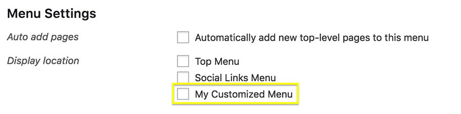 Puedes reemplazar la frase ‘My Customized Menu’ con el nombre que quieras darle al menú. Si vas a ‘Apariencia > Menús’ en tu panel administrativo, deberías ver la nueva opción listada en la página.