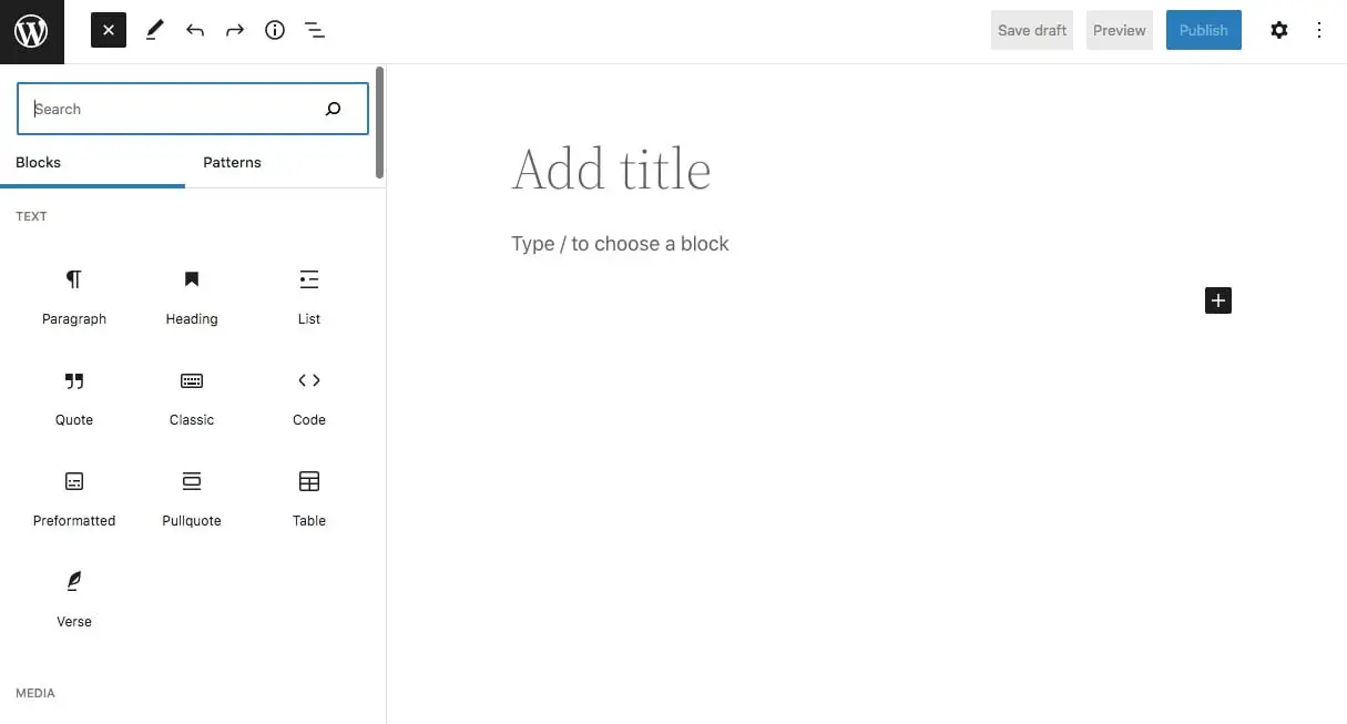 Desde aquí, puedes empezar a crear tu página. Solo tienes que añadir cualquier contenido que quieras al insertar bloques. Por ejemplo, puedes escribir textos en el bloque de párrafo o añadir fotos con un bloque de imagen.