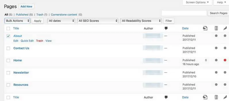 Eliminar una página es un proceso bastante simple. Para hacer esto, ve a la pantalla ‘Páginas’ de tu panel. Pasa tu mouse sobre la página que deseas eliminar y verás la palabra ‘Enviar a la papelera’ en letras rojas: