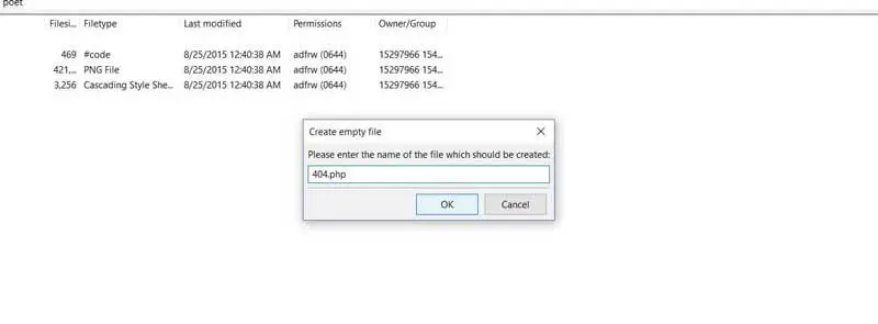 El archivo se abrirá en tu editor de texto. Resalta el código entero en él y cópialo. Ahora regresa a FileZilla y navega de regreso al directorio de temas. Selecciona el tema actual de tu sitio web y haz clic derecho. Selecciona ‘Create new file’ del menú desplegable y nómbralo “404.php”.