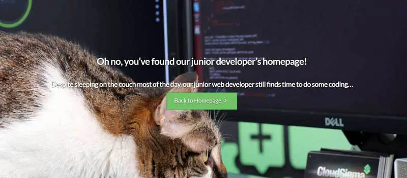 Por ejemplo, Cloud Sigma optó por una explicación peculiar y un botón fácil de encontrar para ‘Volver a la página inicial’. Esto ayuda a disminuir la frustración, mientras que también habilita al usuario para regresar al sitio principal con interrupciones mínimas.