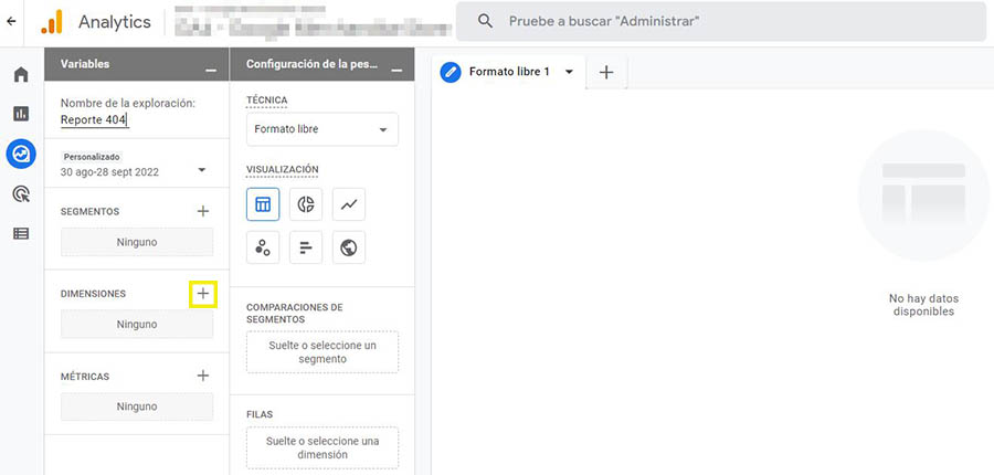 Nombra tu reporte “Reporte 404” y haz clic en el signo + junto a ‘Dimensiones’: