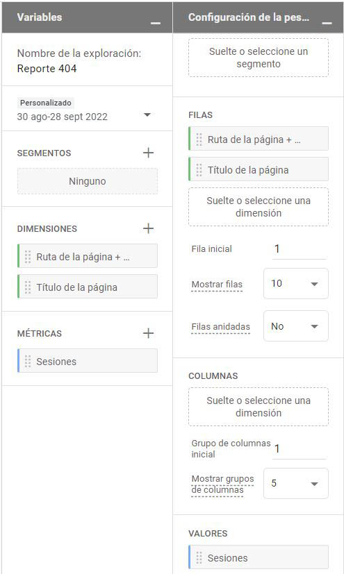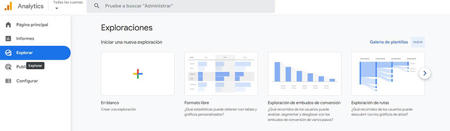 Google Analytics es grandioso para desenterrar errores 404. En el panel de GA dirígete a la sección ‘Explorar’ y elige ‘Blanco’: