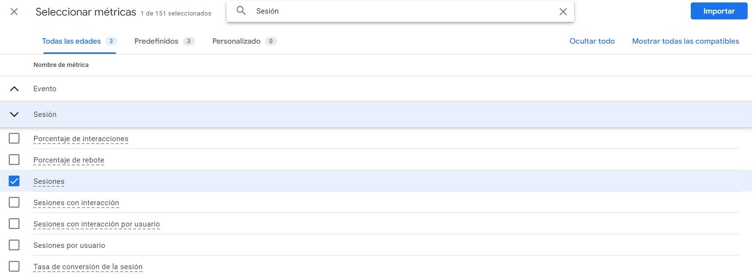Selecciona ‘Página o pantalla> ruta de página + cadena de Consulta‘ y ‘Título de la página‘ desde las dimensiones disponibles y haz clic en ‘Importar’. A continuación, haz clic en el signo ‘+’ junto a la opción ‘Métricas’ para encontrar e importar ‘Sesiones’.