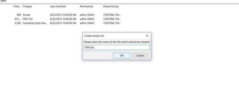 El archivo se abrirá en tu editor de texto. Resalta el código entero en él y cópialo. Ahora regresa a FileZilla y navega de regreso al directorio de temas. Selecciona el tema actual de tu sitio web y haz clic derecho. Selecciona ‘Create new file’ del menú desplegable y nómbralo “404.php”.