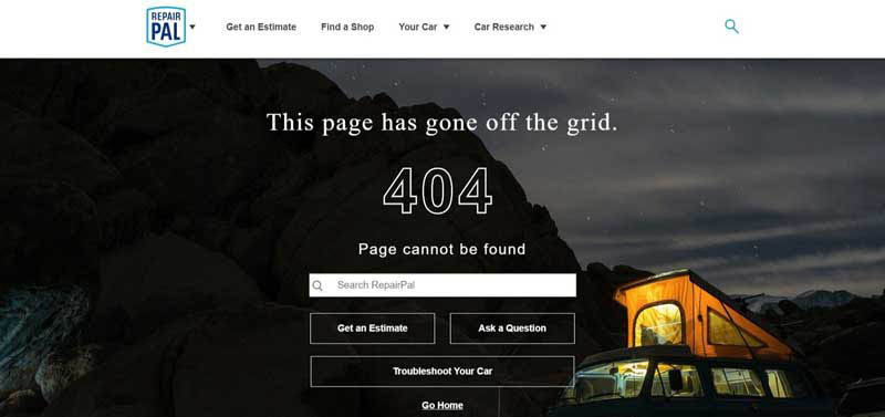 Repair Pal presenta otro buen ejemplo de una página de error 404 bien implementada. Optaron por apegarse a su tema predeterminado — manteniendo el menú de navegación intacto — mientras que también le proporcionan a los usuarios una manera de interactuar inmediatamente con la página.