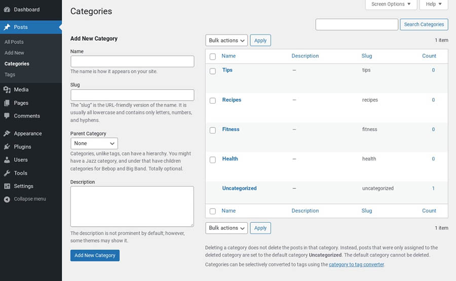 Asignar categorías y etiquetas a tus publicaciones es una forma de clasificarlas. Las categorías generalmente son descriptores de alto nivel del tema de una publicación. Por ejemplo, si administras un blog de salud, puede que tengas categorías llamadas “Nutrición” y “Fitness”.