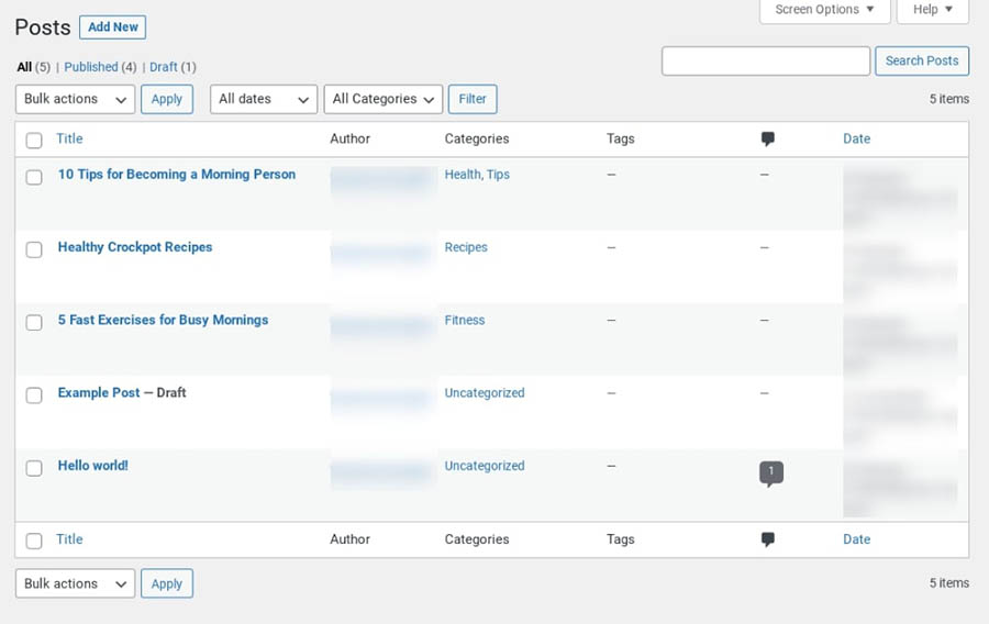 En general, encontrarás que esta pantalla es útil cuando se trata de llevar registro de tus publicaciones. Puedes ver el autor de cada una, las etiquetas, categorías y fecha de publicación, todo sin tener que visitar las publicaciones individualmente. Recomendamos familiarizarte con la pestaña ‘Publicaciones’ en general, ya que puede ahorrarte mucho tiempo.