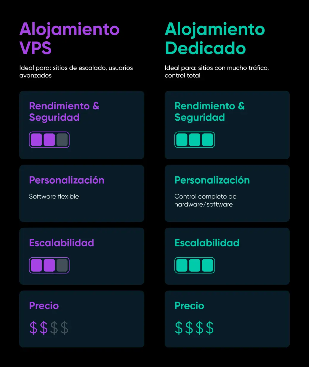 Tanto los planes de VPS como los servidores dedicados ofrecen un mayor nivel de seguridad y rendimiento que el Shared Hosting regular. La diferencia radica en el tamaño de la mejora.