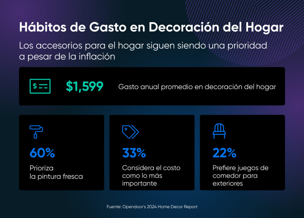 El estadounidense promedio gasta $5,635 en renovaciones y proyectos de remodelación del hogar, y $1,598 USD en decoración del hogar cada año, según el Informe de Decoración del Hogar de Opendoor 2024.
