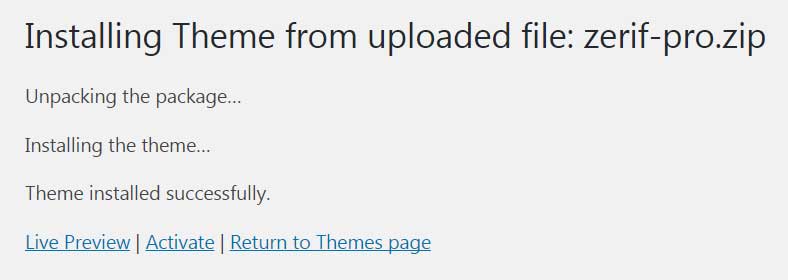 WordPress se tomará unos momentos para instalar el tema. Luego se te proporcionarán algunas opciones adicionales.