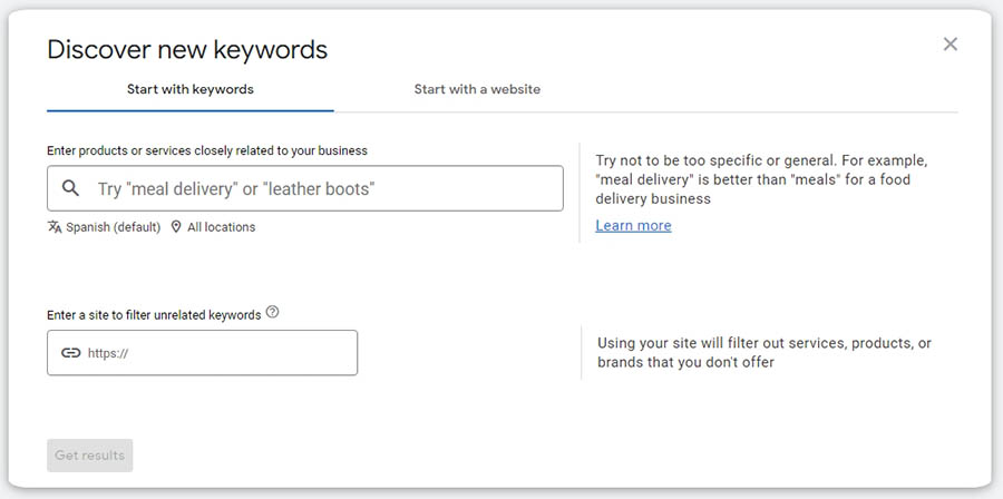 En el cuadro de búsqueda, introduce palabras y frases relacionadas con tu negocio o introduce la URL de tu sitio web. Presiona Enter, pero recuerda separar múltiples entradas con comas. Haz clic en Obtener resultados. Ahora puedes ajustar o agregar palabras clave y aplicar filtros para refinar tu búsqueda de palabras clave.