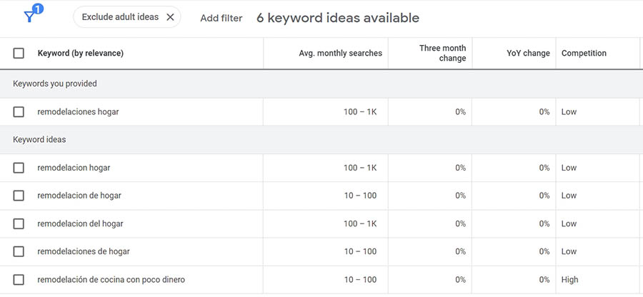 Idealmente, querrás estrechar gradualmente los resultados para identificar palabras clave con baja competencia y mayor volumen de búsqueda.
