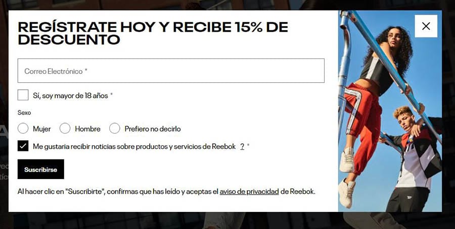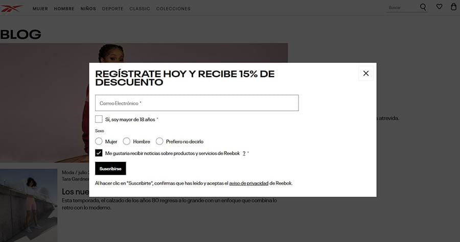 Otra forma de incluir suscriptores en tu lista de correo es ofreciendo un descuento generoso único. Este puede ser especialmente efectivo, ya que también incentiva a los usuarios a comprar tu producto inmediatamente.