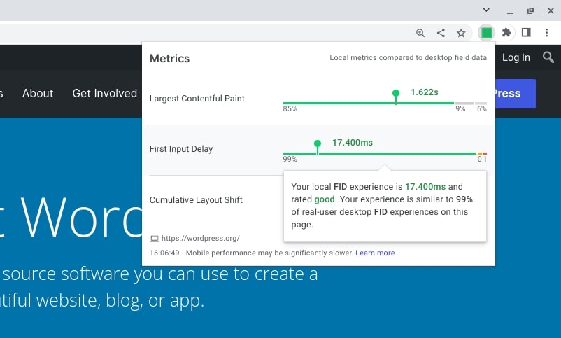 Si eres usuario de Chrome, puedes usar la extensión Web Vitals de Chrome para evaluar tus Métricas Web Principales en cualquier sitio web en el que estés.