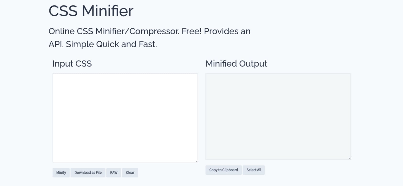Introduces tu CSS y seleccionas el botón de Minify. Luego, puedes copiar y pegar la salida para descargar y reemplazar tu código.