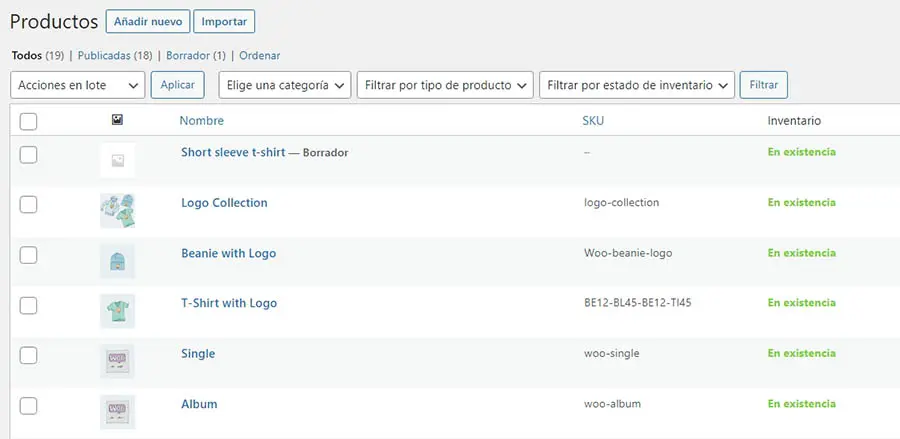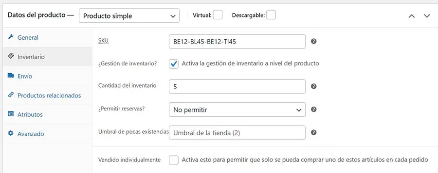 Si usas WooCommerce tienes acceso a un sistema de inventario básico. El plugin te permite ingresar manualmente la cantidad de productos que hay en existencia y se actualiza cuando los clientes efectúan una compra.