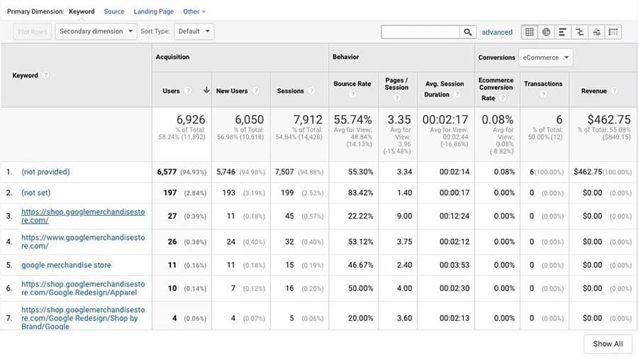 Esto incluye cuantos usuarios nuevos han usado ciertas palabras clave, cada cuánto han visitado las páginas, y si generaron ingresos para tu sitio web. Aprender sobre de dónde proviene tu tráfico orgánico y que están haciendo, te permite determinar con precisión los problemas a resolver (tales como un alto tráfico orgánico con pocos resultados en conversiones).