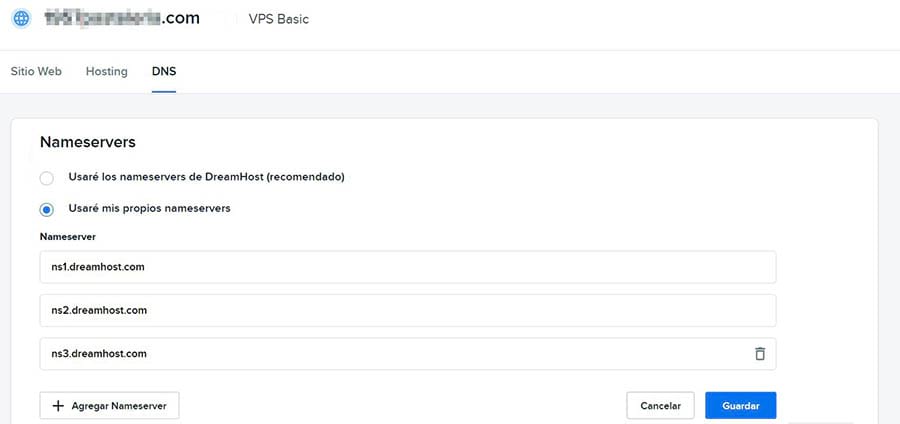 Si tu dominio está registrado con DreamHost, podrás editar tus nameservers. Por ejemplo, si deseas reemplazar tus nameservers actuales, simplemente puedes borrarlos de la casilla y escribir los nuevos.