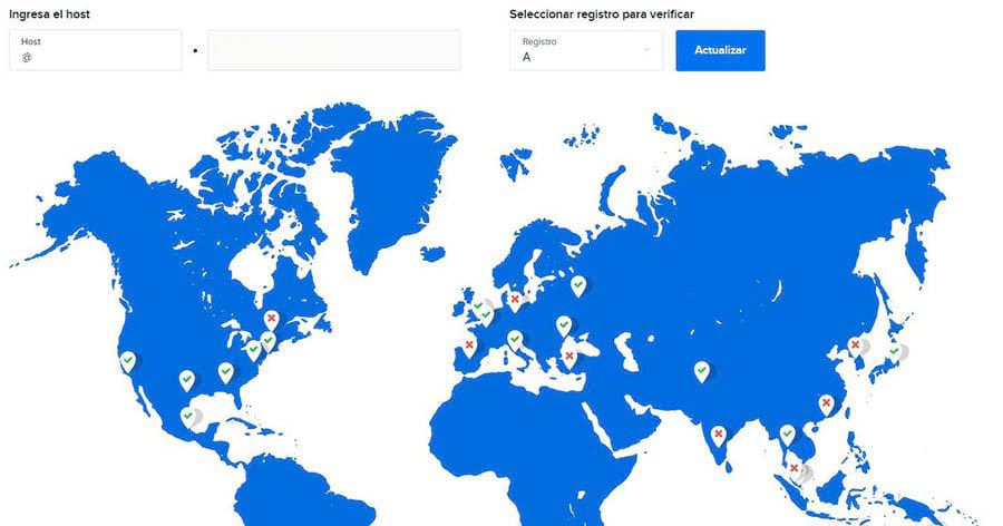 En DreamHost, ofrecemos una herramienta de verificación de propagación DNS para ayudarte a monitorear tus registros. También puedes utilizar el verificador de propagación de ViewDNS.info o whatsmydns.net, que incluso tiene un mapa que muestra la dirección IP actual de tu dominio y la información de los registros DNS en múltiples servidores de nombres en todo el mundo.