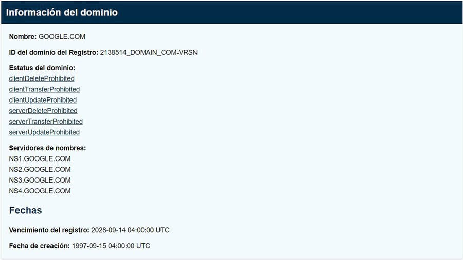 Alternativamente, puedes descubrir cuáles son los nameservers de un sitio web al realizar una búsqueda WHOIS. Los nameservers son registros públicos, entonces es posible encontrar esta información usando una herramienta de terceros.