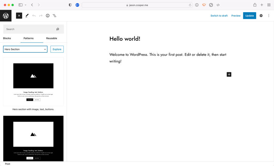 - Puedes usar patrones de bloques predefinidos de diseñadores profesionales: Puedes modificar estas plantillas para que coincidan con tu estilo, dándote muchas opciones para jugar al crear una entrada o página.