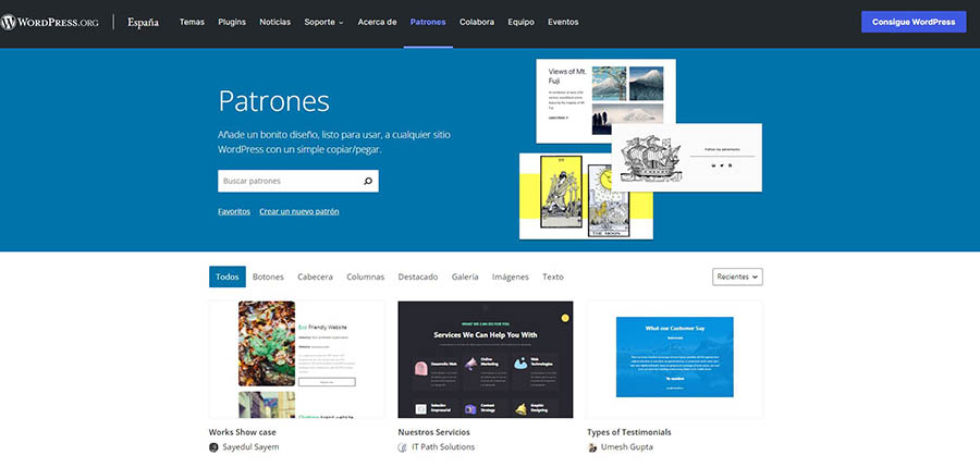 Al igual que con los temas, WordPress tiene un directorio donde las personas comparten patrones de bloques.