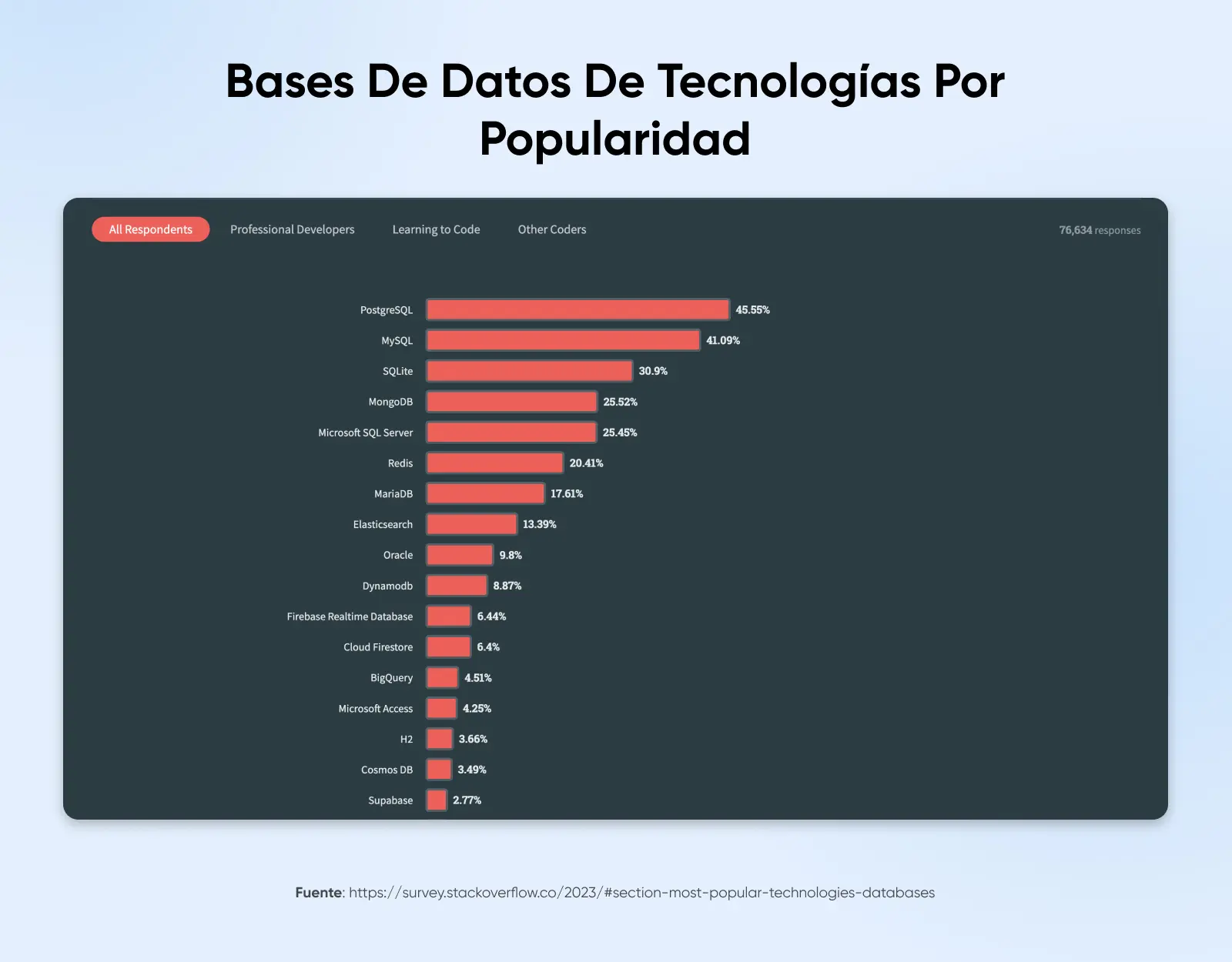 PostgreSQL es una base de datos relacional de código abierto de nivel empresarial. Utilizada por más del 45% de los 76,000 encuestados en la reciente encuesta de desarrolladores de StackOverflow, PostgreSQL superó a MySQL para convertirse en la base de datos más popular en 2024.