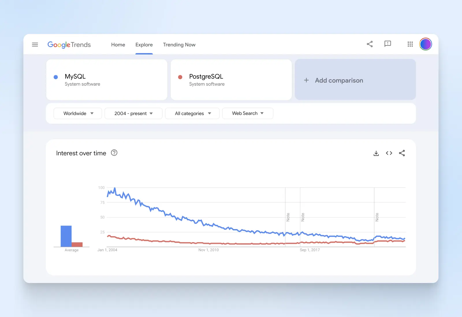 Según Google Trends, el interés en MySQL ha disminuido significativamente, acercándose más a PostgreSQL. Sin embargo, ambas bases de datos todavía tienen un gran seguimiento y base de usuarios, lo que les brinda un buen respaldo comunitario.