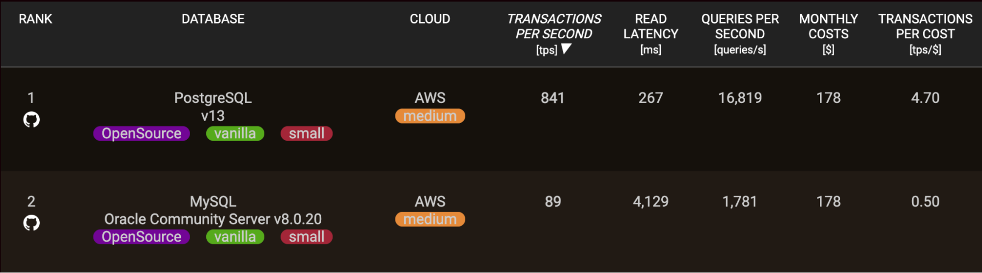 Si pruebas la velocidad de lectura/escritura, notarás que no hay una consistencia en cómo PostgreSQL y MySQL se desempeñan. Esto se debe a que el rendimiento de la base de datos depende en gran medida de tu tipo de carga de trabajo específica, configuración de hardware, esquema y índices de base de datos, y especialmente de la configuración de ajuste de la base de datos. Esencialmente, el rendimiento depende en gran medida de la carga de trabajo y las configuraciones de tu aplicación.