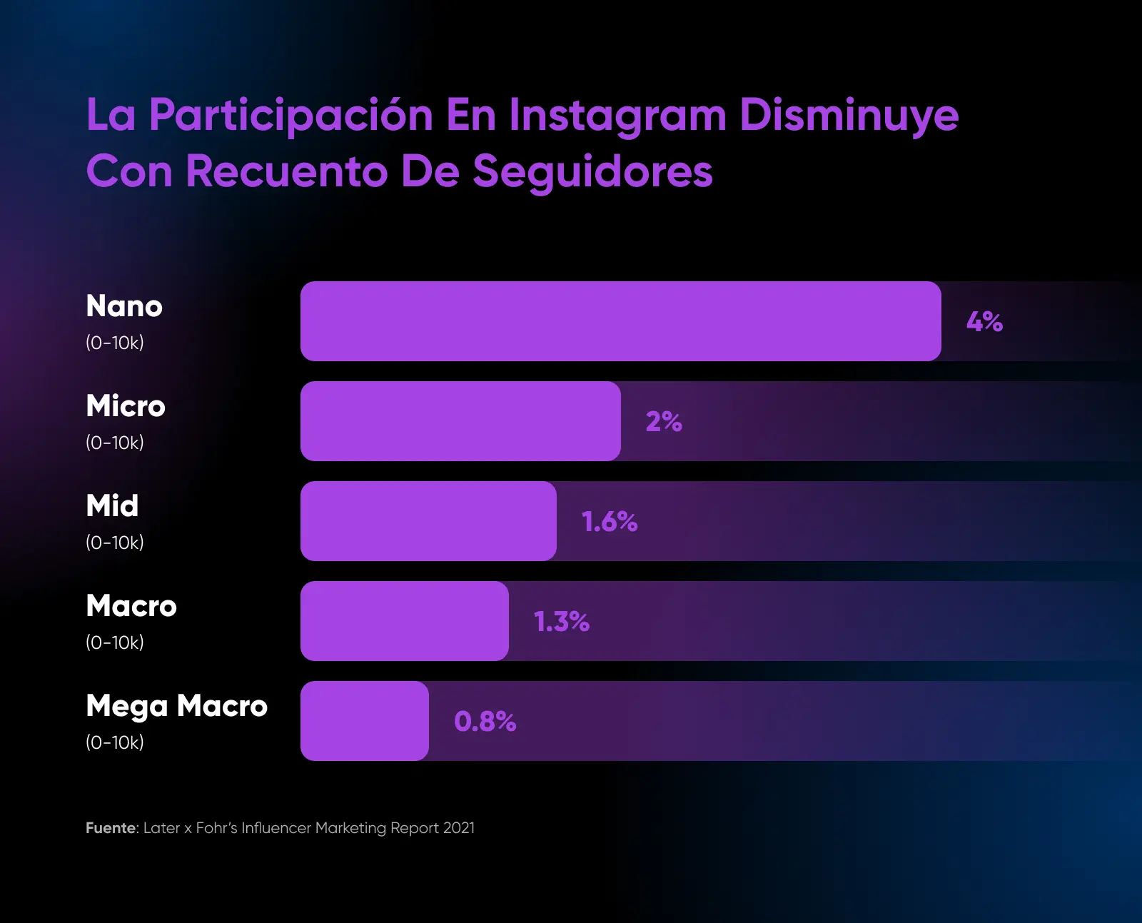 El informe de Marketing de Influencers de Later x Fohr encontró que mientras más pequeño sea el seguimiento, mayor será la participación. La participación en publicaciones y anuncios es exactamente lo que quieres ver como negocio que está gastando su capital duro ganado para ganar reconocimiento y visitas al sitio web.