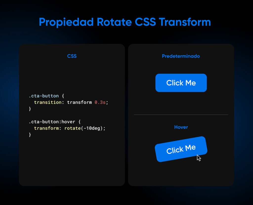 Piensa en sitios web donde has visto imágenes que se inclinan cuando pasas el cursor sobre ellas, un efecto de zoom para ver algo más de cerca, o un ícono en un botón que se mueve cuando pasas el cursor sobre él.