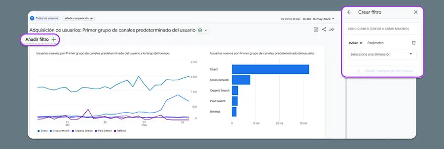 Ya aquí, podrás crear un filtro personalizado, basado en hasta 5 dimensiones diferentes.