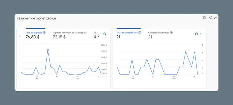 Obtén una vista general de los ingresos que genera tu sitio, sus ventas realizadas, el valor promedio de compras de tus visitantes y mucho más, en el Resumen de Monetización.