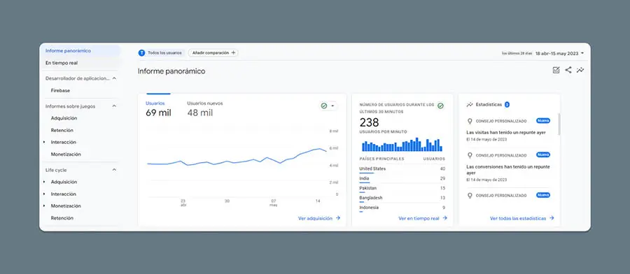 - Informes de Vista General: Son resúmenes de alto nivel, de métricas clave (como adquisición de usuario, tasa de compromiso y recuento de eventos).