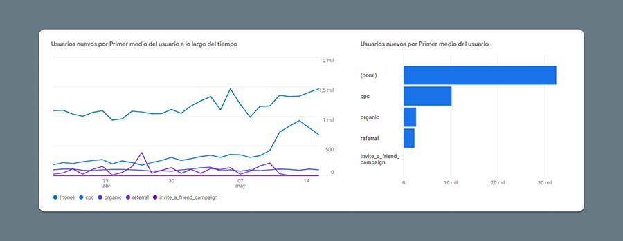 El informe de Adquisición de Usuarios filtrará tu tráfico, para ver solamente cómo llegan nuevos usuarios a tu sitio por primera vez. Es muy útil para comprender mejor cómo la gente descubre tu sitio web. Además, te ayudará con la atribución de marketing digital.