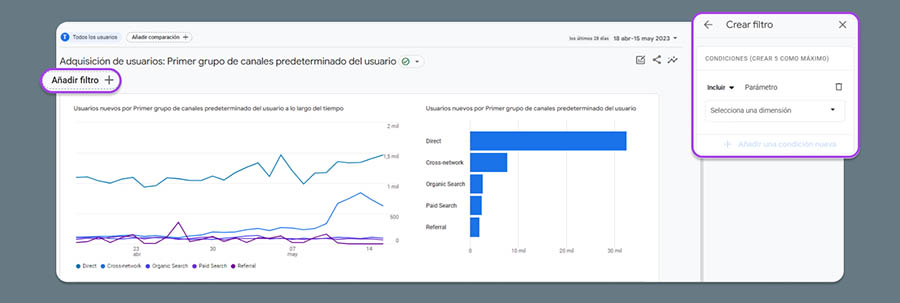 Ya aquí, podrás crear un filtro personalizado, basado en hasta 5 dimensiones diferentes.
