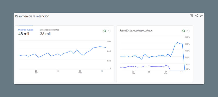 Da un paso más allá, al mirar la retención a lo largo del tiempo, la retención por cohorte y otros informes avanzados, para que entiendas mejor cuándo los usuarios son más propensos a regresar a tu sitio en el futuro.