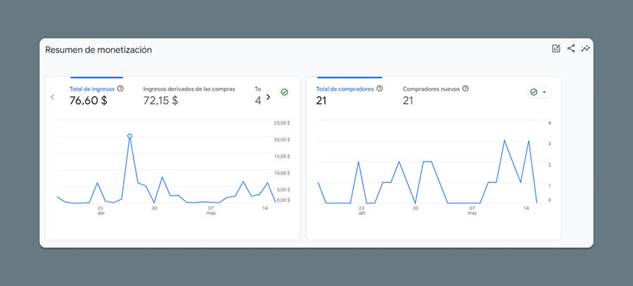 Obtén una vista general de los ingresos que genera tu sitio, sus ventas realizadas, el valor promedio de compras de tus visitantes y mucho más, en el Resumen de Monetización.