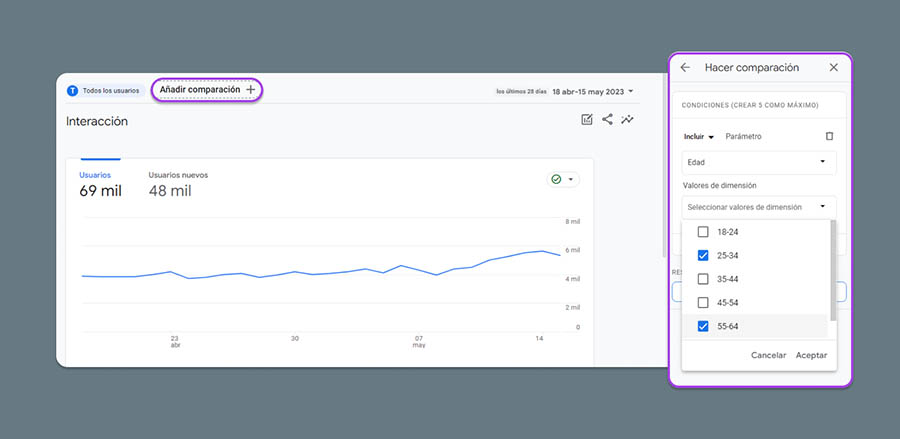 Aquí, podrás ver cómo dos grupos interactúan cara a cara. Por ejemplo, podrás comparar cómo se comporta el tráfico de búsqueda orgánica, junto al tráfico de búsqueda paga.