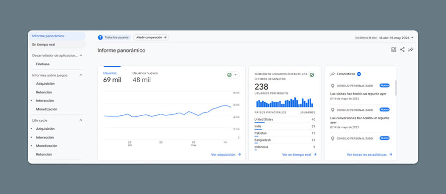 - Informes de Vista General: Son resúmenes de alto nivel, de métricas clave (como adquisición de usuario, tasa de compromiso y recuento de eventos).