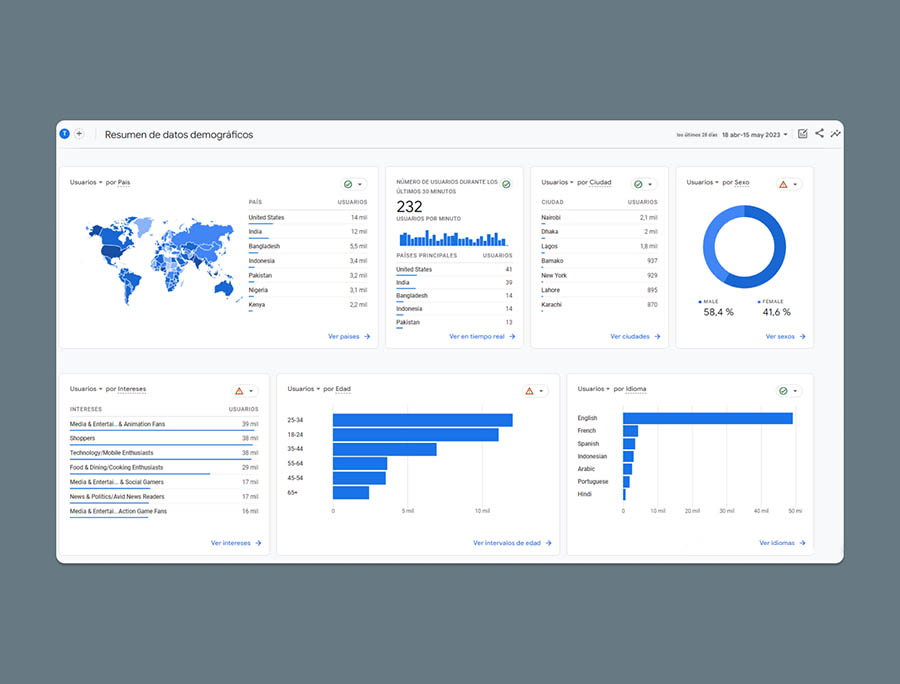 Podrás ver si tu sitio web suele atraer visitantes desde ciertos países, o si es más popular entre hombres o mujeres. Estos datos serán útiles para actividades promocionales y de marketing.