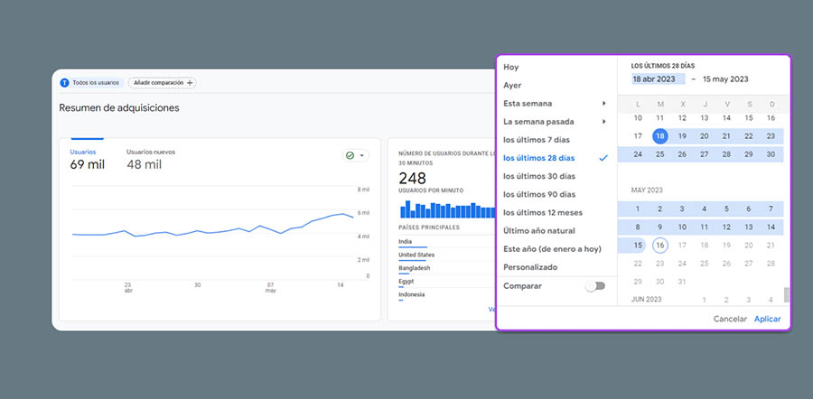 Cada informe de GA4 (excepto los de tiempo real) muestra datos de un rango de tiempo específico.